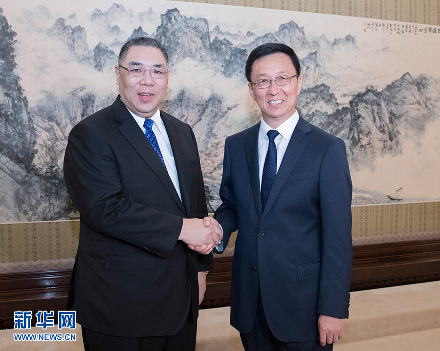 6月28日,中共中央政治局常委、國務(wù)院副總理韓正在北京中南海紫光閣會見澳門特別行政區(qū)行政長官崔世安。 新華社記者王曄攝