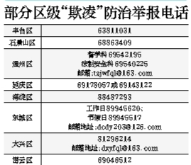 北京青年報(bào)記者注意到,東城、海淀、朝陽(yáng)、豐臺(tái)、石景山、延慶等各區(qū)都建立了由多部門共同組成專門的防治中小學(xué)校欺凌領(lǐng)導(dǎo)小組,來統(tǒng)籌領(lǐng)導(dǎo)和指導(dǎo)本區(qū)學(xué)生欺凌防治工作,協(xié)助各中小學(xué)校穩(wěn)妥處置欺凌事件。在設(shè)立專門領(lǐng)導(dǎo)小組的同時(shí),豐臺(tái)、石景山、通州、延慶以及海淀等區(qū)還公布了區(qū)級(jí)的中小學(xué)校園欺凌專屬的防治、舉報(bào)聯(lián)系電話。