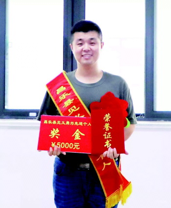 近兩個月前,昌樂小伙劉洋明不顧個人安危徒手將一名墜樓的男童接住,劉洋明見義勇為的事跡得到廣泛贊譽和關(guān)注。7月4日下午,劉洋明被昌樂縣授予“見義勇為先進個人”榮譽稱號,并獎勵5000元獎金,然而,他轉(zhuǎn)身就將獎金捐出。