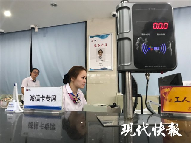 現(xiàn)代快報(bào)記者看到,周萍將市民卡交到營業(yè)人員手中,經(jīng)過核驗(yàn),確認(rèn)她為民政部門報(bào)送的"誠實(shí)守信好市民",點(diǎn)擊升級(jí),不到1分鐘,有著就醫(yī)、乘車等功能的市民卡,就變身為"市民誠信卡"。