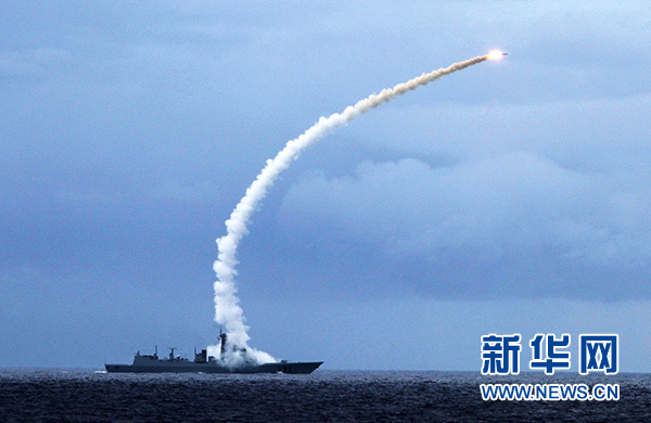 ??谂炘趯崗椦萘曋邪l(fā)射艦空導彈攔截來襲目標(2010年7月26日攝)。 新華社發(fā)