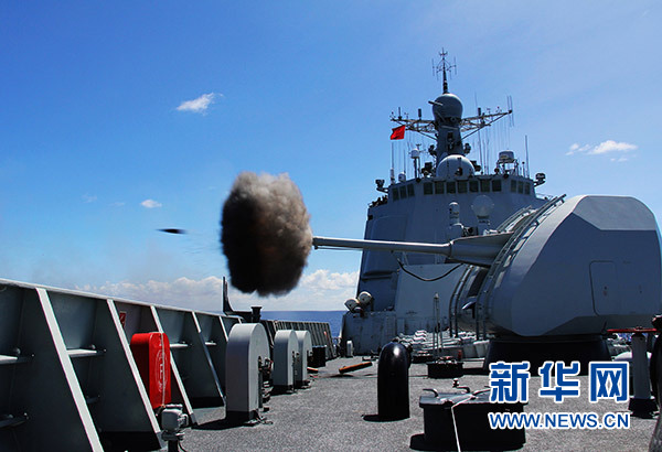 在多國聯(lián)演任務中,海口艦進行主炮射擊(2014年6月19日攝)。 新華社發(fā)(于林 攝)