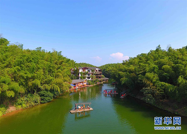 游人乘坐竹排在蜀南竹海內(nèi)游覽。新華社記江宏景攝