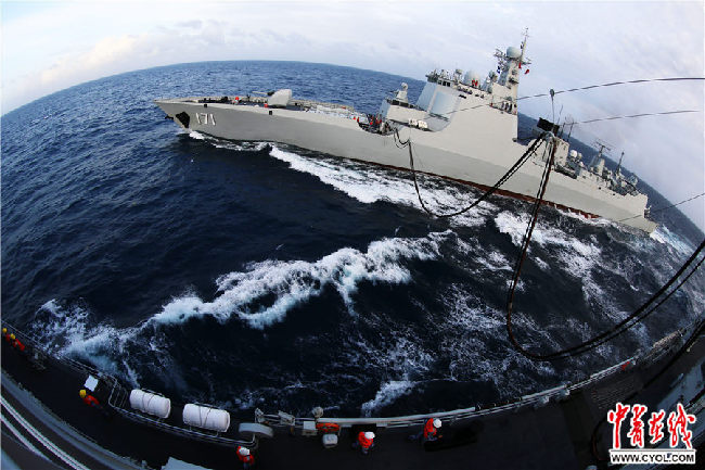 2017年2月6日,??谂瀰⒓舆h海訓(xùn)練,圖為??谂炦M行橫向補給。時明華攝