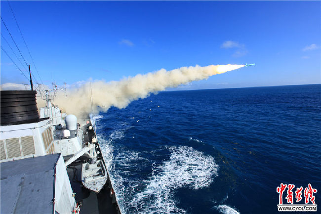 2008年11月8日,??谂炘谀澈S騾⒓訉崗椦萘?xí),圖為??谂灠l(fā)射反艦導(dǎo)彈。