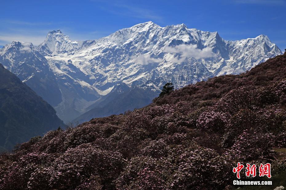 吉隆溝給人最大的感受是驚訝于造物的神奇,讓四季并存在這狹小的山谷間。峽谷綠樹成蔭,恬靜的村莊被綠樹環(huán)抱著,不遠(yuǎn)處能清楚地看見若隱若現(xiàn)的雪山。圖為杜鵑花與尼泊爾朗塘雪山交相輝映。 楊建 攝