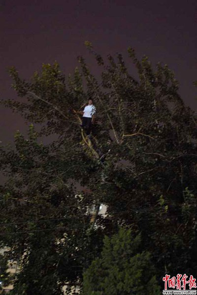 2008年8月8日,北京華嚴(yán)里小區(qū),兩名男子在樹上觀看奧運會開幕式的煙花。中國青年報·中青在線記者 李雋輝/攝