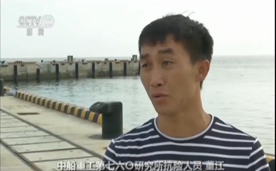 中船重工第七六〇研究所抗險人員董江:“我直接就進到水里了當時,當時就找東西(抓),因為有繩子,水里面當時他們給我們?nèi)恿撕枚嗬K子,就找繩子趕快拽。”