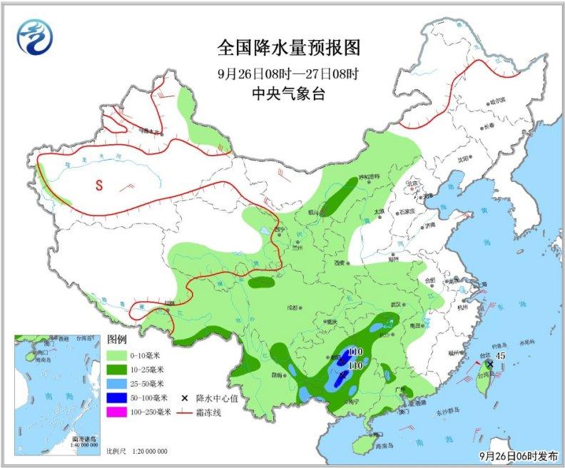 9月26日08時(shí)至27日08時(shí),西北地區(qū)中東部、內(nèi)蒙古中西部、華北北部、黃淮西部、江淮西部、江漢、江南中西部、華南、西南地區(qū)及臺(tái)灣島等地的部分地區(qū)有小到中雨,其中,貴州東南部、廣西西北部等地有大到暴雨,局地有大暴雨(100~110毫米);新疆北部、內(nèi)蒙古西部等地有4~6級(jí)風(fēng)(見(jiàn)圖1)。東海大部海域、臺(tái)灣海峽、臺(tái)灣以東洋面、巴士海峽、南海東北部海域?qū)⒂?~8級(jí)、陣風(fēng)9~10級(jí)的大風(fēng)。