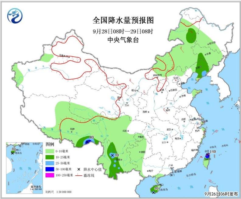 9月28日08時(shí)至29日08時(shí),內(nèi)蒙古中東部、東北地區(qū)中南部、西南地區(qū)西南部和海南島大部以及西藏中東部等地的部分地區(qū)有中到大雨,局地有暴雨或大暴雨(50~140毫米)(見(jiàn)圖3)。東海大部海域、臺(tái)灣海峽、臺(tái)灣以東洋面、南海東北部海域、巴士海峽將有7~8級(jí)、陣風(fēng)9~10級(jí)大風(fēng),其中東海東南部海域、臺(tái)灣以東洋面的部分海域風(fēng)力可達(dá)9~11級(jí)、陣風(fēng)12~13級(jí)。