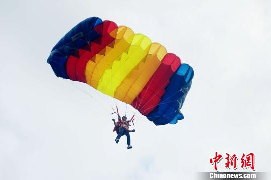 10月1日,石春艷和另兩名國家隊(duì)跳傘運(yùn)動(dòng)員在黃龍洞1500米高空同時(shí)攜帶五星紅旗進(jìn)行了跳傘表演,共同祝福祖國繁榮昌盛。(通訊員 鄧道理 李遠(yuǎn)明)