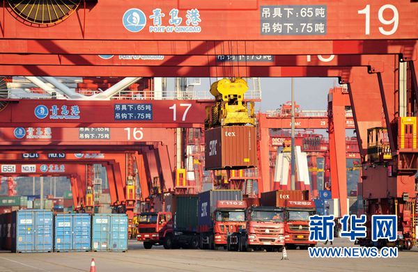 10月12日,車輛在山東青島港外貿(mào)集裝箱碼頭裝運集裝箱。 新華社發(fā)(俞方平 攝)