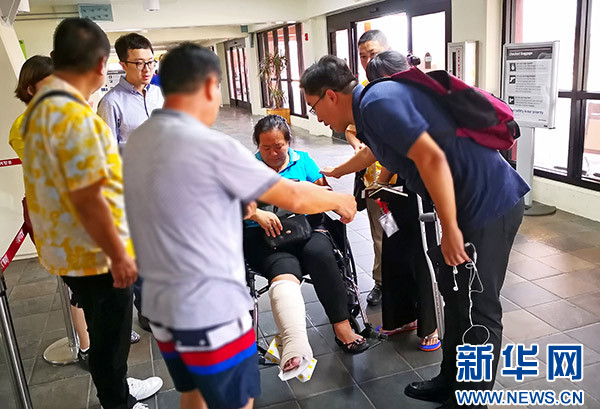 在機場等候的中國乘客秩序井然,許多人舉著國旗合影,非常興奮。一位在塞班開店的王女士腳部骨折,因當(dāng)?shù)蒯t(yī)療條件有限,她向領(lǐng)館尋求幫助,經(jīng)領(lǐng)館協(xié)調(diào),也順利搭上川航飛機回國。
