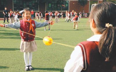 武漢市紅領(lǐng)巾學(xué)校學(xué)生在操場(chǎng)上分組玩“穿梭拉拉球”游戲。本報(bào)記者 田豆豆攝