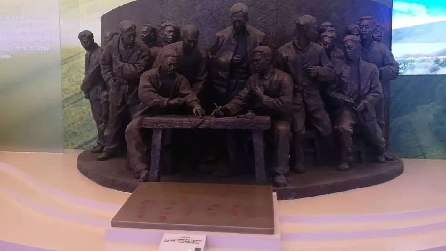 “我們的家鄉(xiāng),在希望的田野上?!?978年冬,安徽鳳陽縣小崗村18位農民堅定地按下紅手印,實施包產到戶,拉開了中國農村改革的大幕,成為中國改革的標志。這座雕塑讓我們重溫那個永載歷史的瞬間。