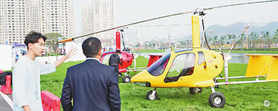 工作人員向觀眾介紹一款可搭載測繪儀器的自動旋翼機。新華社發(fā)