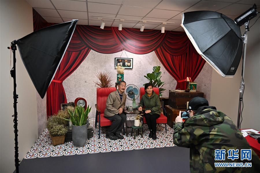 兩名參觀者在“時(shí)光博物館”里的年代照相館拍照留念。新華社記者李鑫 攝
