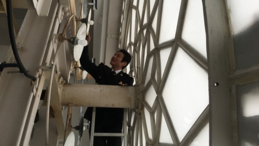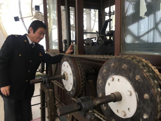 2018年最后一天,上海海關(guān)不上班,但魏云寺依然保持他3天一個(gè)輪回的節(jié)奏——坐電梯到海關(guān)大樓頂樓,打開(kāi)一扇門,沿著僅容一人通行的鋼制螺旋扶梯,踩69級(jí)臺(tái)階,登上鐘樓機(jī)芯房,給大鐘上發(fā)條并校正時(shí)間,全程15分鐘。如此重復(fù)性工作,看上去并無(wú)太多技術(shù)含量,要說(shuō)他最大的付出,就是已被“套牢”的28年。
