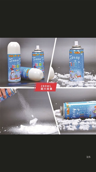這種“雪花噴霧”外觀類似罐裝的小瓶殺蟲劑噴霧,搖晃后按壓,即可噴出類似雪花的白色泡沫狀物質(zhì),落在衣服上或物品上,一段時間后會化成水狀。