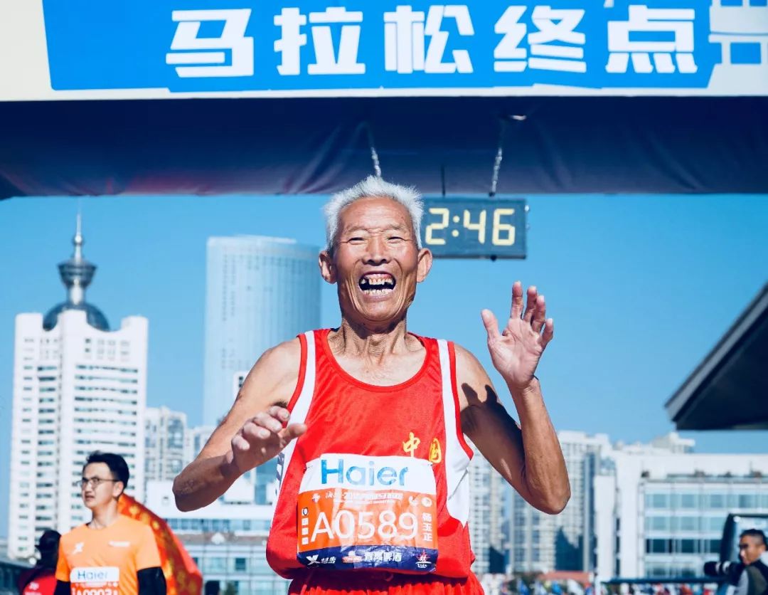 2018-10-28,青島。一名白發(fā)老人完成馬拉松后很開(kāi)心。作者:feng