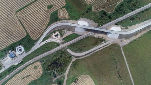 平改立工程K11公里道口,已建成的沙土橋梁??梢钥吹较聵虻妮o路和橋梁之間,完全沒有預(yù)留轉(zhuǎn)彎的空間。(8月28日 航拍圖)達(dá)日罕攝