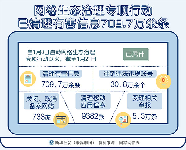 新華社北京1月23日電(記者史競男、白瀛)記者23日從國家網(wǎng)信辦獲悉,自1月3日啟動網(wǎng)絡(luò)生態(tài)治理專項行動以來,截至1月21日,已累計清理有害信息709.7萬余條,注銷違法違規(guī)賬號30.8萬余個,關(guān)閉、取消備案網(wǎng)站733家,清理移動應(yīng)用程序9382款,受理相關(guān)舉報5.3萬條。