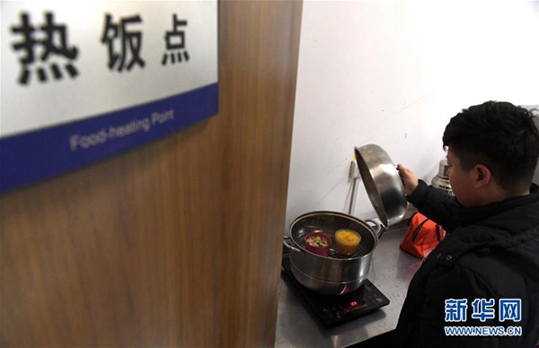 1月22日,李翔在新鄉(xiāng)東站熱飯點為妻子加熱晚餐。新華社記者 李安 攝
