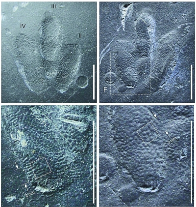 這些精致的小龍足跡一共有4個(gè),組成了一道行跡,仿佛跨越了1億年的時(shí)空遇到人類?!靶↓堊阚E僅在韓國(guó)和中國(guó)發(fā)現(xiàn),是東亞白堊紀(jì)的特有足跡。這是世界上第10處發(fā)現(xiàn)有小龍足跡的化石點(diǎn),也是首次發(fā)現(xiàn)這種足跡的皮膚印痕?!绷昼姁湼嬖V記者。此前,古生物學(xué)家從未發(fā)現(xiàn)過(guò)有如此完美的皮膚印痕,足跡上的鱗片痕跡平均直徑還不到0.4毫米,而且不同于此前的鱗片印痕僅出現(xiàn)在足跡的部分區(qū)域,小龍足跡保存了整個(gè)腳底的皮膚。