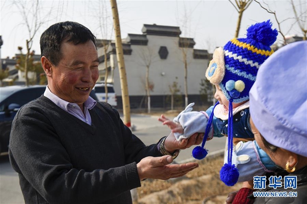 馬國權(quán)在潤豐村的新家門前陪小孫子玩耍(2月18日攝)。新華社發(fā)(馮開華 攝)