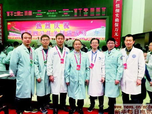 ▲1月11日,北京航天飛行控制中心,科普載荷總設(shè)計(jì)師謝更新(右四)、副總指揮楊小俊(右五)、主任設(shè)計(jì)師張?jiān)獎(jiǎng)?右二)以及航天五院、中科院光電所等單位參研人員合影慶祝嫦娥四號(hào)任務(wù)圓滿成功?!∈茉L者供圖