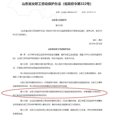 昨天,新京報(bào)記者從相關(guān)部門獲得的一份發(fā)布會(huì)文字資料顯示,為保護(hù)女職工在勞動(dòng)中的安全與健康,維護(hù)女職工合法權(quán)益,制定了《辦法》《辦法》共26條,經(jīng)山東省政府第28次常務(wù)會(huì)議通過,2019年1月16日簽發(fā)公布,自2019年3月1日起施行。