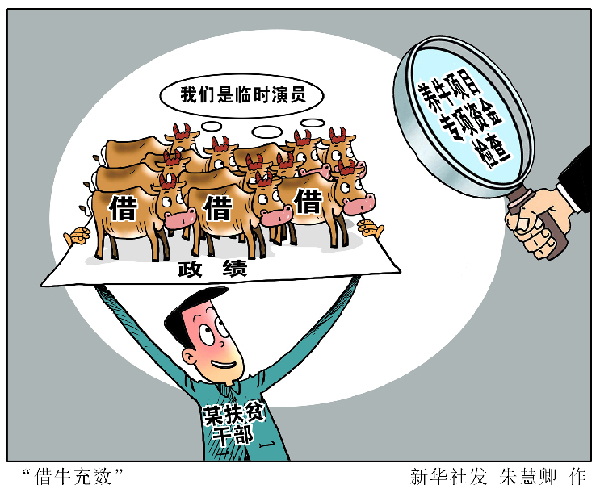 為應對國務院扶貧辦養(yǎng)牛項目專項資金檢查,居然想出臨時借用百余頭牛放入牛圈,以營造養(yǎng)牛項目“紅火”的主意。吉林省紀委近日通報一起借牛假冒政績的典型問題,相關責任人受到嚴肅查處問責。“借牛充數(shù)”事件敲響警鐘:脫貧攻堅越到最后時刻越要響鼓重錘,決不能搞急功近利、虛假政績的東西。