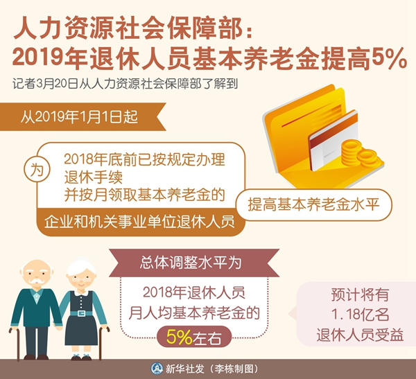 新華社北京3月20日電(記者葉昊鳴)記者20日從人力資源社會(huì)保障部了解到,從2019年1月1日起,為2018年底前已按規(guī)定辦理退休手續(xù)并按月領(lǐng)取基本養(yǎng)老金的企業(yè)和機(jī)關(guān)事業(yè)單位退休人員提高基本養(yǎng)老金水平,總體調(diào)整水平為2018年退休人員月人均基本養(yǎng)老金的5%左右,預(yù)計(jì)將有1.18億名退休人員受益。