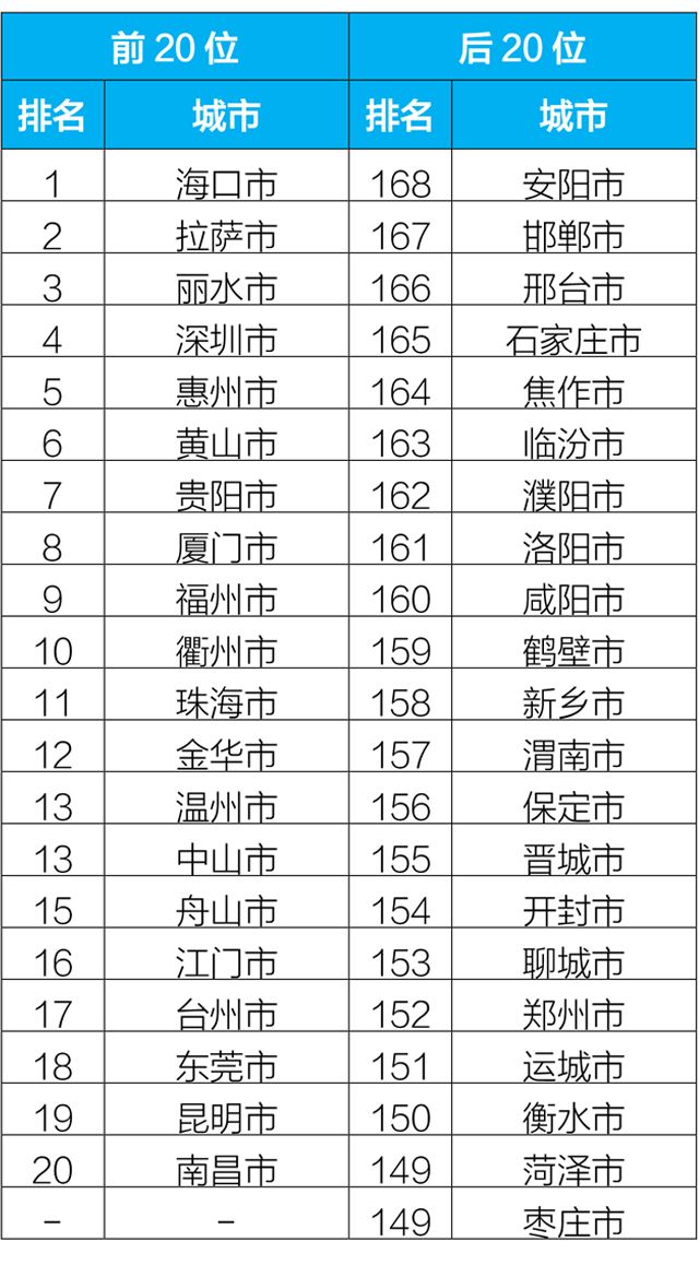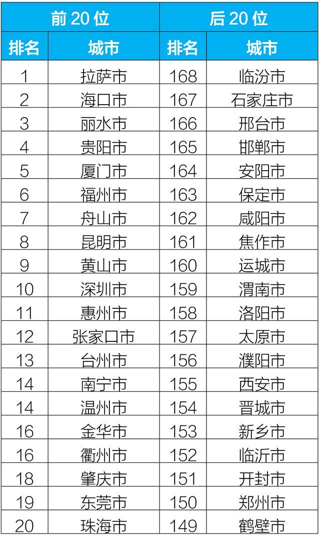 2019年1-2月,168個(gè)重點(diǎn)城市中臨汾、石家莊、邢臺(tái)市等20個(gè)城市空氣質(zhì)量相對(duì)較差(從第168名到第149名);拉薩、??凇Ⅺ愃械?0個(gè)城市空氣質(zhì)量相對(duì)較好。?