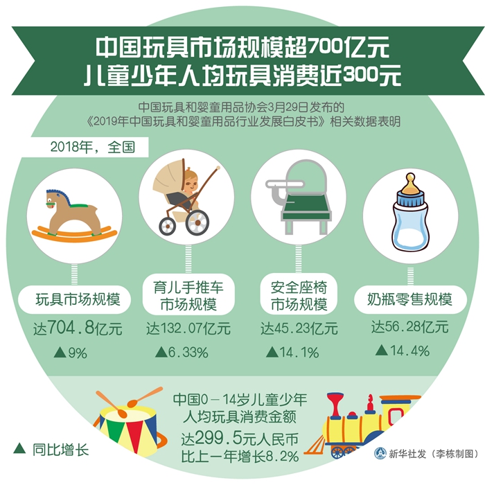 新華社上海3月29日電(記者 吳宇)2018年,中國(guó)0-14歲兒童少年人均玩具消費(fèi)金額達(dá)299.5元人民幣,比上一年增長(zhǎng)8.2%;2019年,中國(guó)65.6%的消費(fèi)者計(jì)劃增加玩具消費(fèi)支出,63.9%的消費(fèi)者計(jì)劃增加?jì)胪闷废M(fèi)支出。