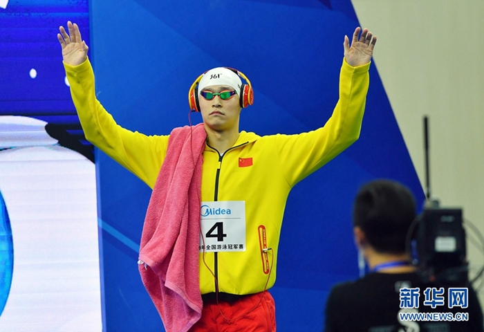 3月27日,浙江隊(duì)選手孫楊在賽前出場。當(dāng)日,在青島舉行的2019年全國游泳冠軍賽暨世錦賽選拔賽男子800米自由泳決賽中,浙江隊(duì)選手孫楊以7分48秒03的成績獲得冠軍。 新華社記者朱崢攝