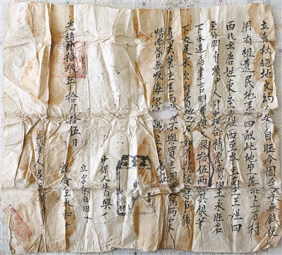 墓主人有可能姓朱。寶頂西北,是王鳳榮家的宅院。王女士收拾屋子時(shí),曾發(fā)現(xiàn)一張百年前的《土地買賣文書》。這張宣紙文書有A3紙大小,綿軟泛黃,滿是褶皺。王鳳榮將其小心翼翼地?cái)傇诓鑾咨希尸F(xiàn)出一篇并不算美觀的毛筆字,其大意為:賣主名叫朱自旺,因手頭缺錢,將祖遺民地一處四畝,賣予王永旺名下,賣價(jià)文銀十五兩,立字為證,光緒二十三年(1897年)。文書上還有三處紅章,但字跡已是漫漶不清。