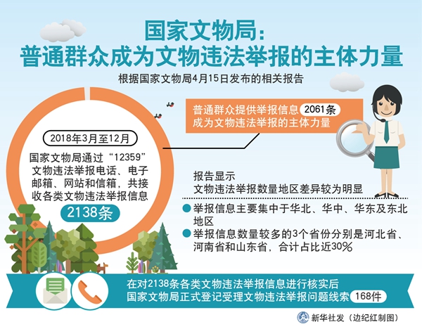 新華社北京4月15日電(記者施雨岑)根據(jù)國家文物局15日發(fā)布的相關(guān)報告,2018年3月至12月,國家文物局通過“12359”文物違法舉報電話、電子郵箱、網(wǎng)站和信箱,共接收各類文物違法舉報信息2138條。普通群眾提供舉報信息2061條,成為文物違法舉報的主體力量。