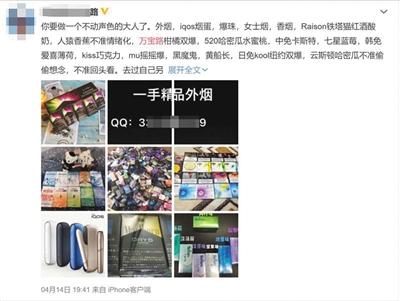 網(wǎng)上賣煙廣告,留有QQ號。 本版圖片均為微博截屏圖