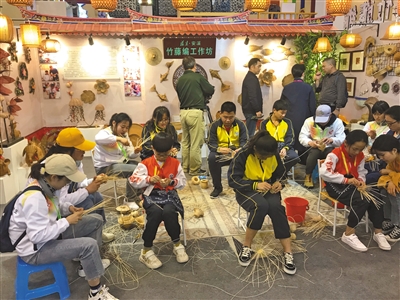 學(xué)生藝術(shù)實踐工作坊,來自福建安溪的小學(xué)生展示竹藤編。新京報記者 馮琪 攝