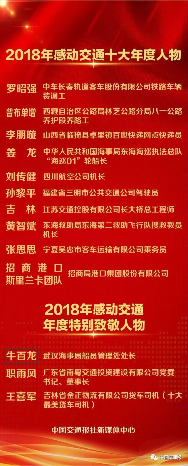 另外,將青春和生命奉獻(xiàn)給海事交通事業(yè)的武漢海事局船員管理處處長(zhǎng)牛百龍;胸懷大愛(ài),積極踐行“大道為公”理念的廣東南粵交通投資建設(shè)有限公司黨委書(shū)記、董事長(zhǎng)職雨風(fēng);400萬(wàn)公里安全駕駛、細(xì)心工作、熱心助人的吉林省物流貨車(chē)司機(jī)王喜軍榮獲“2018年感動(dòng)交通年度特別致敬人物”稱(chēng)號(hào)。