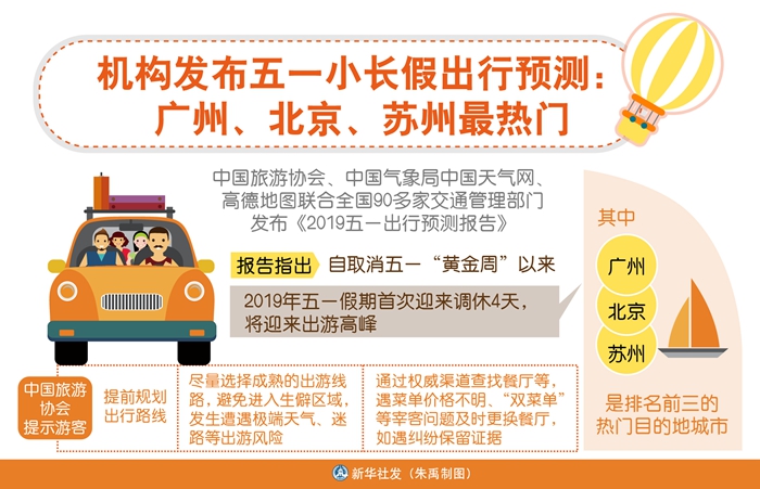 新華社北京4月29日電(記者魯暢)中國旅游協(xié)會、中國氣象局中國天氣網(wǎng)、高德地圖聯(lián)合全國90多家交通管理部門發(fā)布《2019五一出行預(yù)測報(bào)告》,報(bào)告指出,自取消五一“黃金周”以來,今年五一假期首次迎來調(diào)休4天,將迎來出游高峰,其中廣州、北京、蘇州是排名前三的熱門目的地城市。