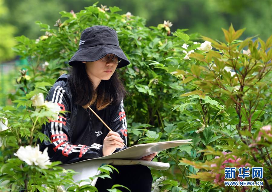 寫生愛好者在洛陽(yáng)國(guó)家牡丹園內(nèi)寫生(4月24日攝)。新華社記者 李嘉南 攝