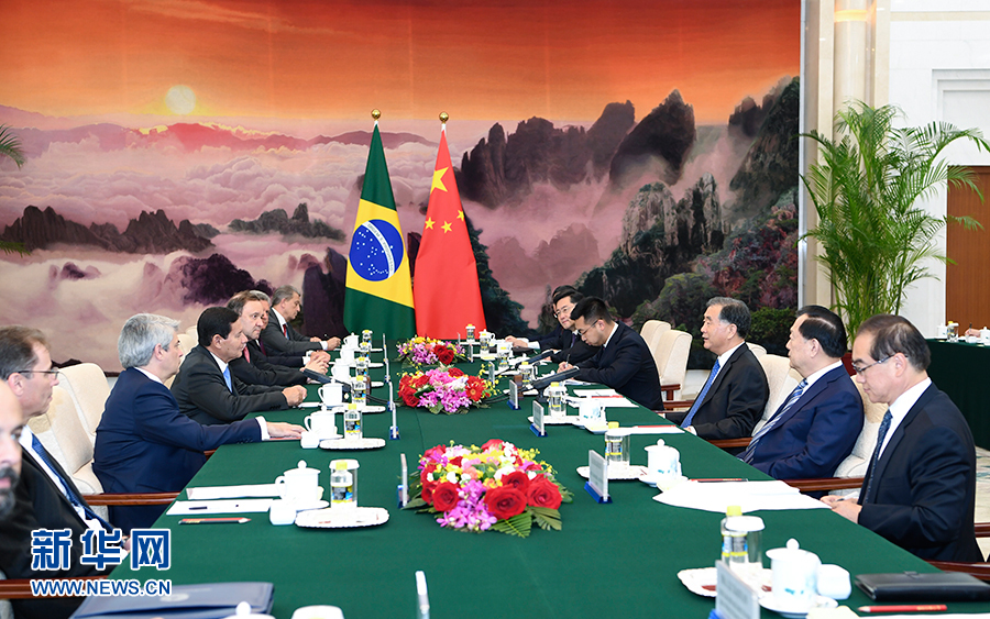 5月24日,全國(guó)政協(xié)主席汪洋在北京人民大會(huì)堂會(huì)見巴西副總統(tǒng)莫朗。新華社記者 張領(lǐng) 攝