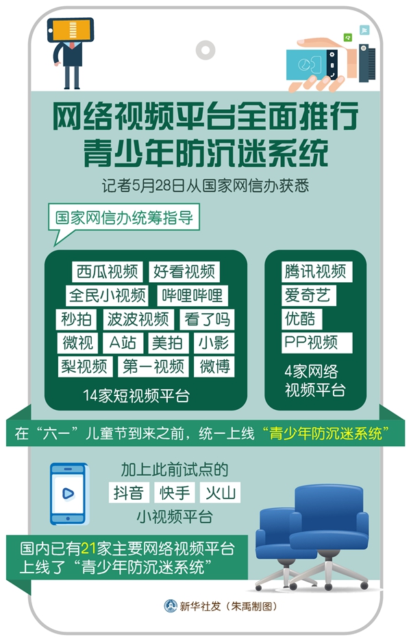 新華社北京5月28日電(記者余俊杰)記者28日從國家網(wǎng)信辦獲悉,國家網(wǎng)信辦統(tǒng)籌指導(dǎo)西瓜視頻、好看視頻、全民小視頻、嗶哩嗶哩、秒拍、波波視頻、看了嗎、微視、A站、美拍、小影、梨視頻、第一視頻、微博等14家短視頻平臺,以及騰訊視頻、愛奇藝、優(yōu)酷、PP視頻等4家網(wǎng)絡(luò)視頻平臺,在“六一”兒童節(jié)到來之前,統(tǒng)一上線“青少年防沉迷系統(tǒng)”。