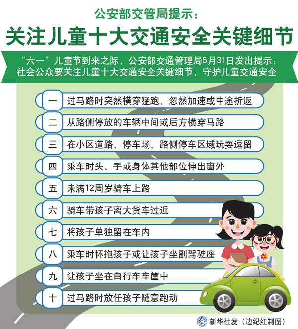 新華社北京5月31日電(記者王茜)兒童的交通危險(xiǎn)認(rèn)知、自我保護(hù)能力不強(qiáng),容易受到交通意外的傷害。“六一”兒童節(jié)到來之際,公安部交通管理局31日發(fā)出提示:社會公眾要關(guān)注兒童十大交通安全關(guān)鍵細(xì)節(jié),守護(hù)兒童交通安全。