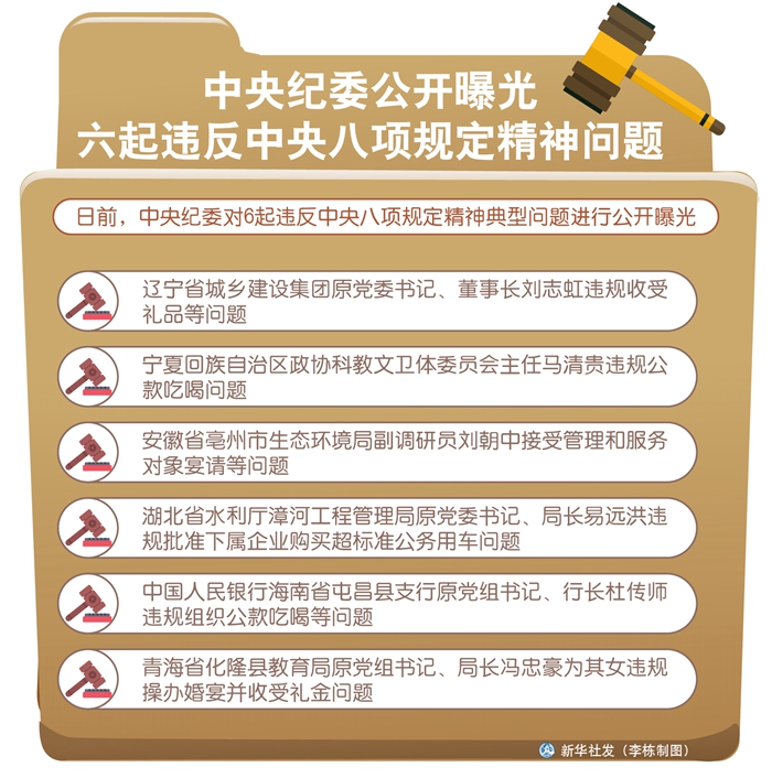 中央紀委有關負責人指出,上述6起問題中,有的違規(guī)組織公款吃喝,有的違規(guī)收受禮品禮金,有的違規(guī)接受宴請,有的超標準購買公務用車,有的大操大辦、收錢斂財,有的紀檢監(jiān)察干部不履行監(jiān)督職責,甚至執(zhí)紀違紀等,而且大部分違紀行為發(fā)生在黨的十九大之后,是典型的不收斂不收手行為。各級黨員領導干部都要引以為戒,自警、自醒、自重。