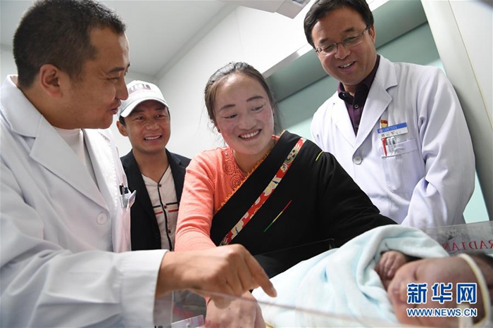 這是來(lái)自北京的援青干部劉云軍(右一)看望新生兒(資料照片)。新華社發(fā)