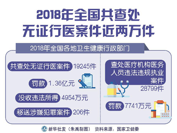 新華社北京6月25日電(記者王秉陽(yáng))國(guó)家衛(wèi)健委近日公布,2018年全國(guó)各地衛(wèi)生健康行政部門共查處無(wú)證行醫(yī)案件19245件,罰款1.36億元,沒(méi)收違法所得4954萬(wàn)元,移送涉嫌犯罪案件206件;查處醫(yī)療機(jī)構(gòu)醫(yī)務(wù)人員違法違規(guī)執(zhí)業(yè)案件28799件,罰款7741萬(wàn)元。