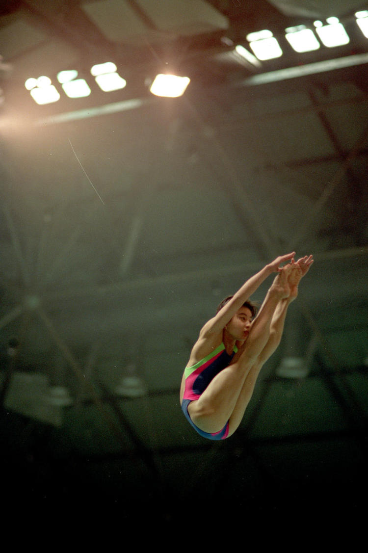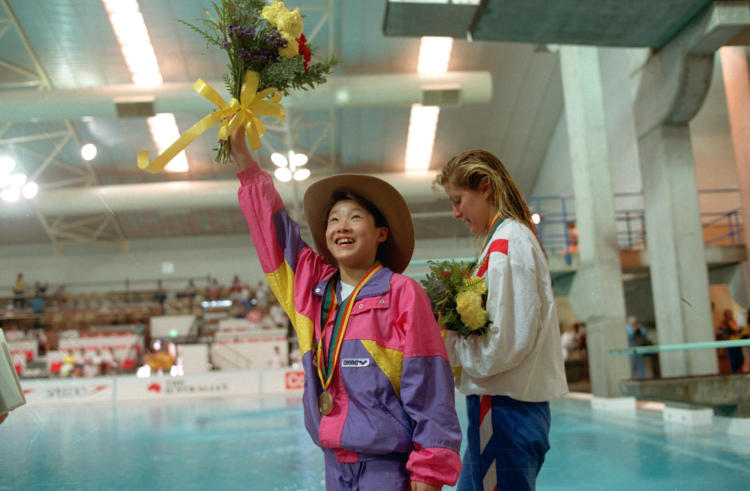 伏明霞在1991年第六屆世界游泳錦標(biāo)賽女子跳臺跳水比賽中獲冠軍。新華社記者 程至善 攝